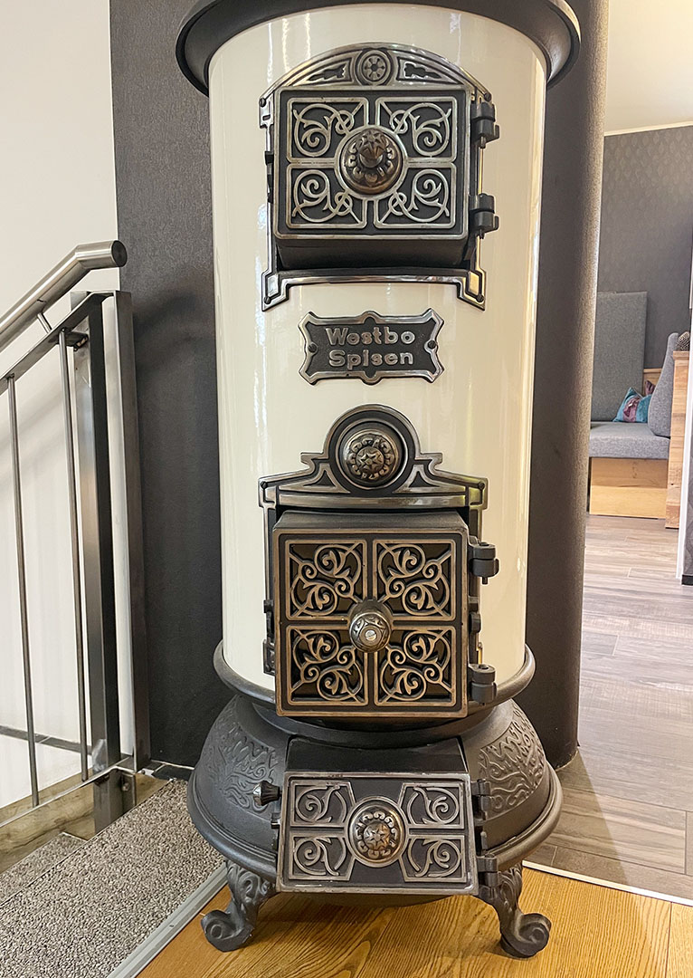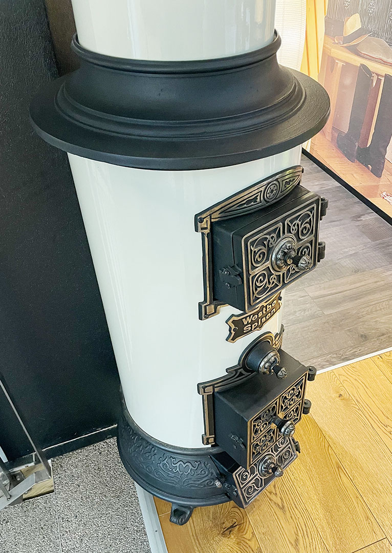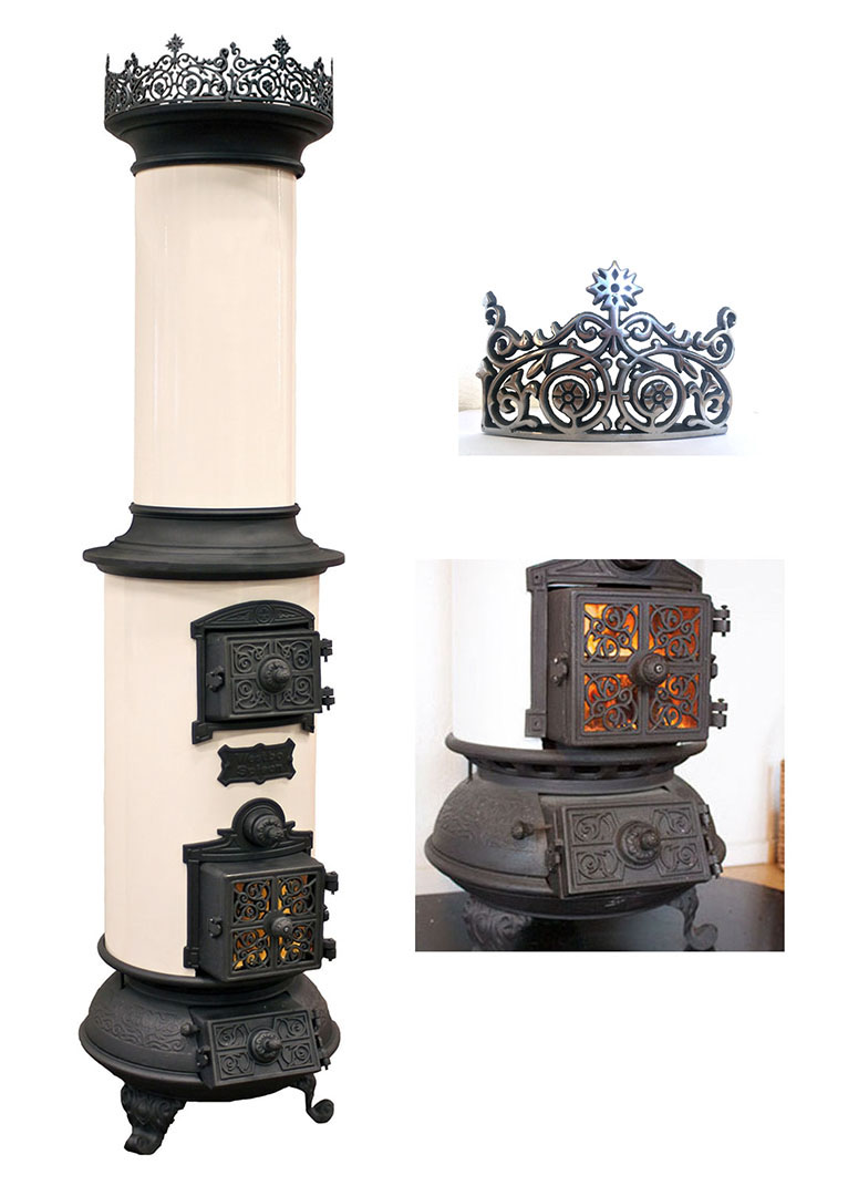 Diese Neuauflage überrascht durch ein modernes Innenleben. Ein massiver Kern aus Gusseisen speichert die Wärme und bietet durch effiziente Wärmeleistung und umweltfreundliche Verbrennung höchsten Komfort. Hinter der verzierten Haupttür ist eine Scheibe, so dass man natürlich das Feuer sehen kann.